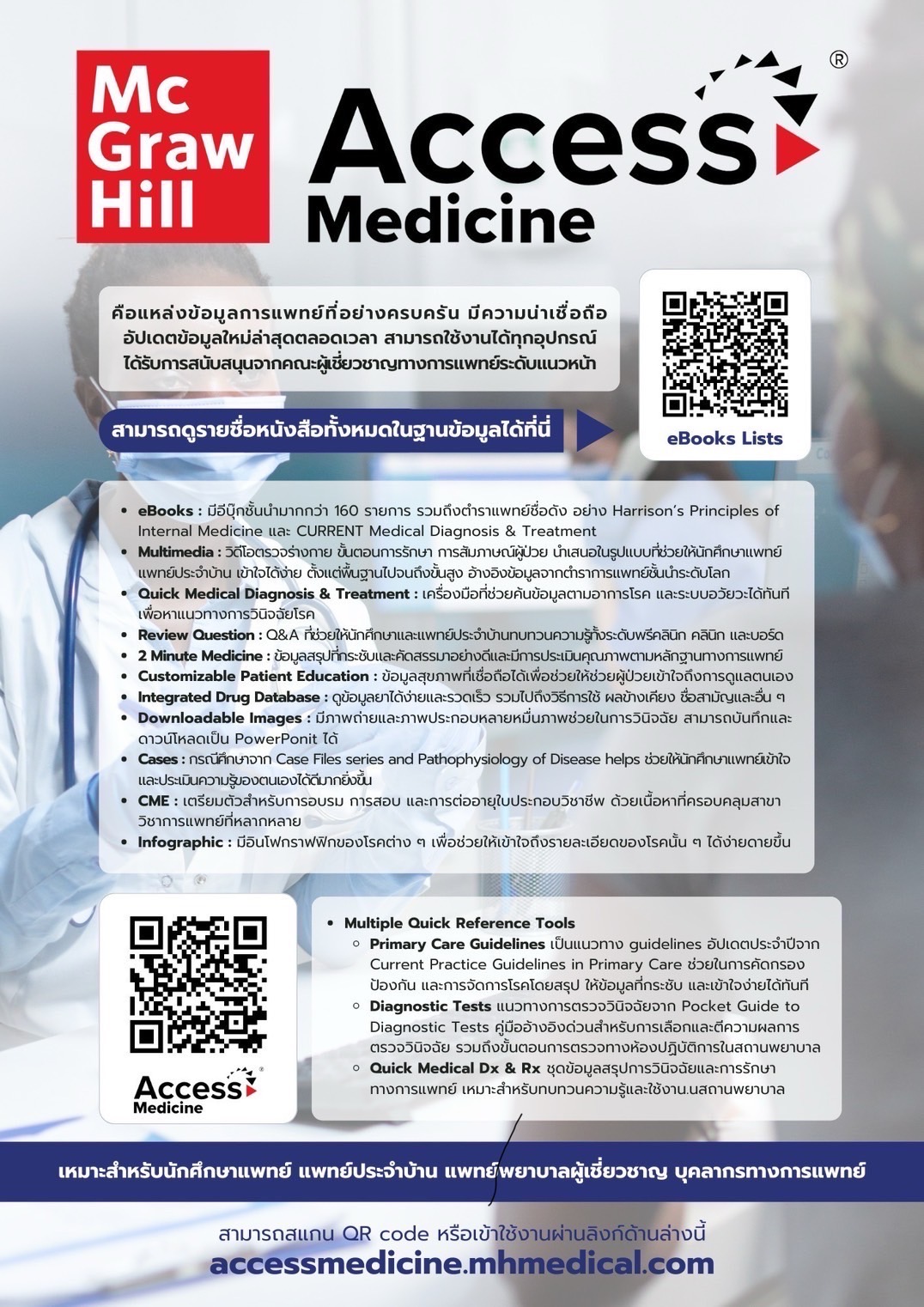 ฐานข้อมูล AccessMedicine เป็นฐานข้อมูลทางการแพทย์ที่ประกอบไปด้วย หนังสือ กรณีศึกษา การทำแบบทดสอบ มัลติมีเดีย แอนิเมชั่น และวีดิโอ ตลอดจนรูปภาพทางการแพทย์ และการศึกษาเรียนรู้ด้านกายวิภาคศาสตร์ คลังข้อมูลยา อินโฟกราฟิกโรคต่างๆ คู่มือดูแลรักษาผู้ป่วย และอื่นๆอีกมากมาย สามารถใช้งานพร้อมกันได้ ไม่จำกัดจำนวนผู้ใช้ และยังสมารถใช้งานผ่านมือถือและแอปพลิเคชันได้