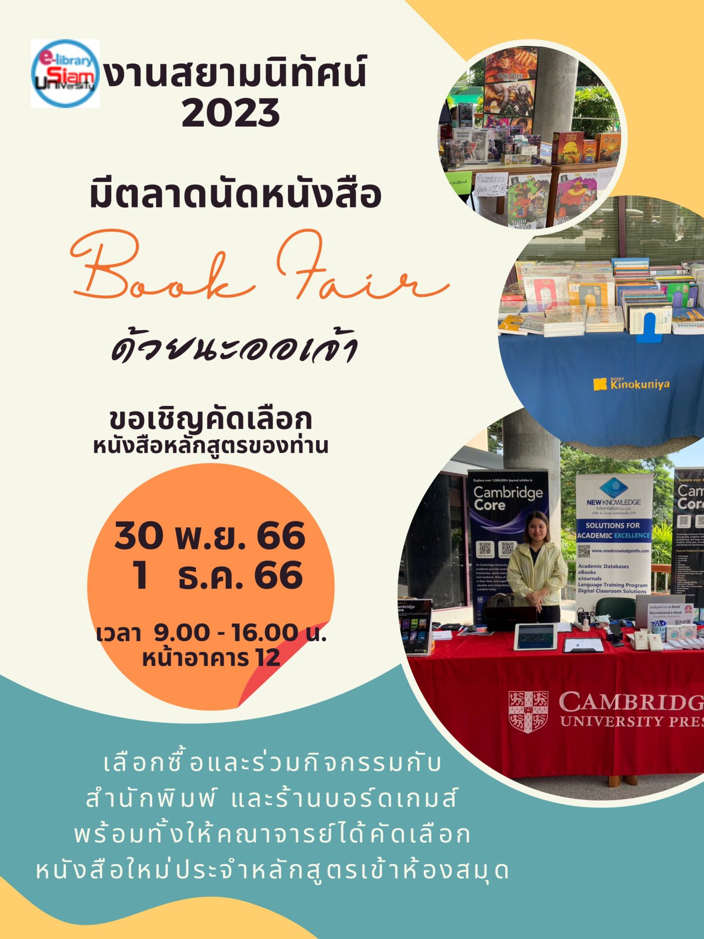 สำนักหอสมุดและทรัพยากรสารสนเทศ มหาวิทยาลัยสยาม ขอเชิญชวน คณาจารย์ และนักศึกษา เลือกซื้อและร่วมกิจกรรมกับ สำนักพิมพ์ และร้านบอร์ดเกมส์ พร้อมทั้งให้คณาจารย์ได้คัดเลือก หนังสือใหม่ประจำหลักสูตรเข้าห้องสมุด ในงานสยามนิทัศน์และตลาดนัดหลักสูตร 2023 ในวันพฤหัสบดีที่ 30 พฤศจิกายน 2566 ถึงวันศุกร์ที่ 1 ธันวาคม 2566 เวลา 09.00-16.00 น. ณ หน้าอาคาร 12