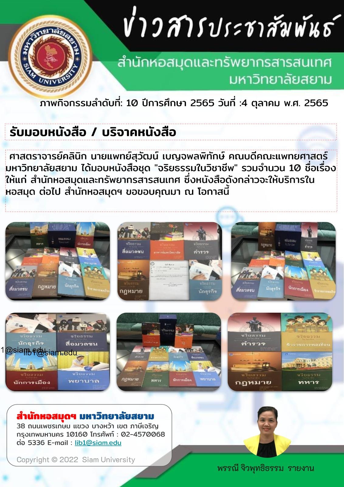 ศาสตราจารย์คลินิก นายแพทย์สุวัฒน์ เบญจพลพิทักษ์ คณบดีคณะแพทยศาสตร์ มหาวิทยาลัยสยาม ได้มอบหนังสือชุด “จริยธรรมในวิชาชีพ” รวมจำนวน 10 ชื่อเรื่อง ให้แก่ สำนักหอสมุดและทรัพยากรสารสนเทศ ซึ่งหนังสือดังกล่าวจะให้บริการในหอสมุด ต่อไป สำนักหอสมุดฯ ขอขอบคุณมา ณ โอกาสนี้
