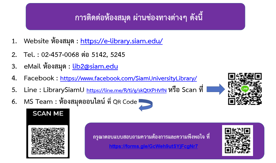 - บริจาคหนังสือเป็นไฟล์ดิจิทัล แจ้งความประสงค์ พร้อมส่งไฟล์ของหนังสือมาใน แบบฟอร์มหนังสือรับบริจาค หรือที่ lib2@siam.edu