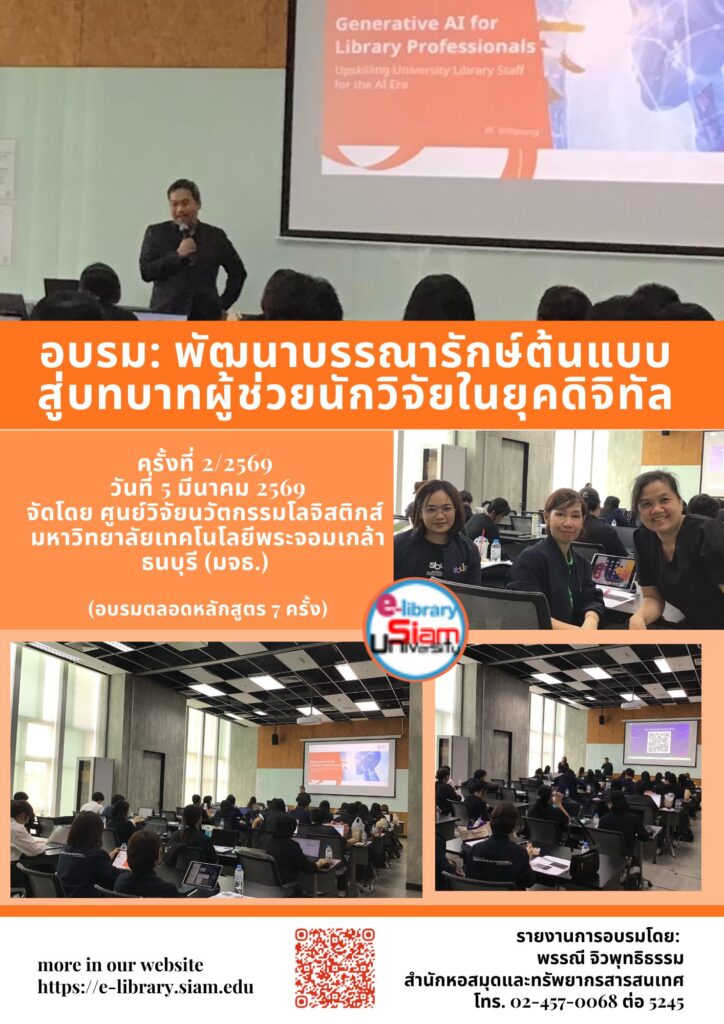 การอบรม: พัฒนาบรรณารักษ์ต้นแบบสู่บทบาทผู้ช่วยนักวิจัยในยุคดิจิทัล ครั้งที่ 2/05-03-2569: การประยุกต์ใช้ปัญญาประดิษฐ (AI) ในงานวิจัย ศูนย์วิจัยนวัตกรรมโลจิสติกส์ มหาวิทยาลัยเทคโนโลยีพระจอมเกล้าธนบุรี (มจธ.) เล็งเห็นความสำคัญในการยกระดับทักษะบุคลากรห้องสมุด ให้มีศักยภาพสอดคล้องกับเทคโนโลยีสารสนเทศและปัญญาประดิษฐ์ในปัจจุบัน จึงได้จัดโครงการ “พัฒนาบรรณารักษ์ต้นแบบสู่บทบาทผู้ช่วยนักวิจัยในยุคดิจิทัล” เพื่อสร้างบรรณารักษ์ต้นแบบที่มีทักษะสนับสนุนงานวิจัยและบริการวิชาการอย่างเป็นรูปธรรม โดยมีกำหนดการอบรมตลอดหลักสูตร 7 ครั้ง / 7 วัน ในช่วงเดือน กุมภาพันธ์ – เมษายน 2569 เวลา 09.00 – 16.00 น. ของทุกวัน (ยกเว้นวันสุดท้าย) ณ อาคาร KX (Knowledge Xchange) กรุงเทพมหานคร ในการนี้สำนักหอสมุดและทรัพยากรสารสนเทศ มหาวิทยาลัยสยาม ได้พิจารณาจัดส่งบุคลากรเข้าร่วมอบรมคือ นางพรรณี จิวพุทธิธรรม ซึ่งได้เข้าร่วมอบรมใน ครั้งที่ 2/2569: การประยุกต์ใช้ปัญญาประดิษฐ (AI) ในงานวิจัย เมื่อวันพฤหัสบดีที่ 5 มีนาคม 2569 ได้รับองค์ความรู้เพิ่มขึ้นจากการอบรม ดังนี้ องค์ความรู้ที่ได้รับจากการอบรม: […]