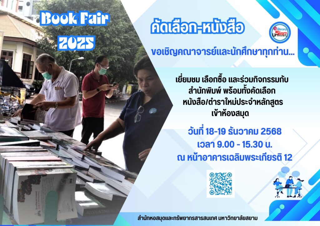 สำนักหอสมุดและทรัพยากรสารสนเทศ มหาวิทยาลัยสยาม จัดออกร้านหนังสือ Book Fair 2025 ในวันที่ 18-19 ธันวาคม 2568 ตั้งแต่เวลา 9.00 – 15.30 น. ณ บริเวณ หน้าตึก 12 (อาคารเฉลิมพระเกียรติ 12) เพื่อให้คณาจารย์และนักศึกษา ได้ทำการคัดเลือกหนังสือ หรือตำราหลัก ไว้ประกอบหลักสูตร การเรียน การสอน และการวิจัย ซึ่งมีสำนักพิมพ์ที่ขอร่วมออกร้าน ได้แก่ คิโนะคูนิยะ บุ๊คสโตร์, เคเอ็นเอส บุ๊ค, ซีเอ็ดยูเคชั่น, มายบุ๊คสโตร์ บุญรอด คอร์เปอร์เรชั่น, และบุ๊คเน็ท เป็นต้น สำนักฯ จึงขอเรียนเชิญให้คณะกรรมการบริหารสำนักฯ ในส่วนของคณะวิชา คณาจารย์ และนักศึกษา คัดเลือกและเสนอซื้อหนังสือเข้าห้องสมุด เพื่อให้ผู้ใช้บริการมีหนังสือที่สอดคล้องกับความต้องการของตนเองมากที่สุด