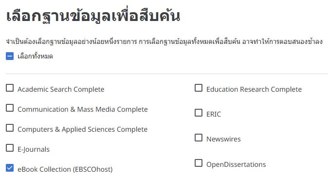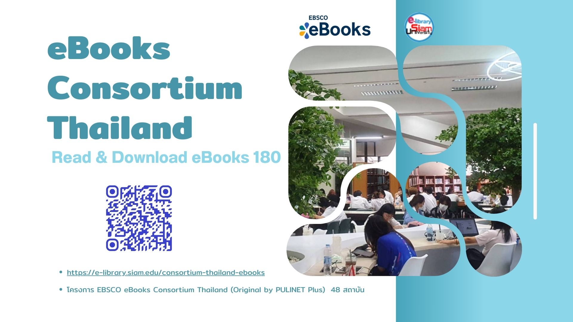 โครงการ EBSCO eBooks Consortium Thailand (Original by PULINET Plus) มีกลุ่มเครือข่ายรวม 48 สถาบัน จัดซื้อ eBooks ร่วมกัน 180 ขื่อเรื่อง ให้ดาวน์โหลดและเลือกอ่านได้จาก: ฐานข้อมูล eBook Collection (EBSCOhost) หรือตรวจสอบรายชื่อหนังสือได้ที่ Thailand-eBook-Consortium-180-titles ครอบคลุมหลากหลายสาขาวิชา ทั้งด้านวิชาการและการศึกษา ศิลปะ ชีวประวัติ ธุรกิจและอาชีพ เด็กและเยาวชน สิ่งแวดล้อม สุขภาพและฟิตเนส ไลฟ์สไตล์ การเติบโตส่วนบุคคล การเมืองและกฎหมาย ศาสนา วิทยาศาสตร์และการวิจัย เทคโนโลยี และการแพทย์ ซึ่งคณะแพทยศาสตร์ ได้เข้าร่วมจัดซื้อเรื่อง Human Anatomy & Physiology, Global Edition และ คณะทัศนมาตรศาสตร์ เรื่อง Dealing with Nearsightedness during Development (and Post-Development) ใช้บริการนอกเครือข่ายสถาบัน (WiFi)ใช้ user: siam เและ Password: library@2569
