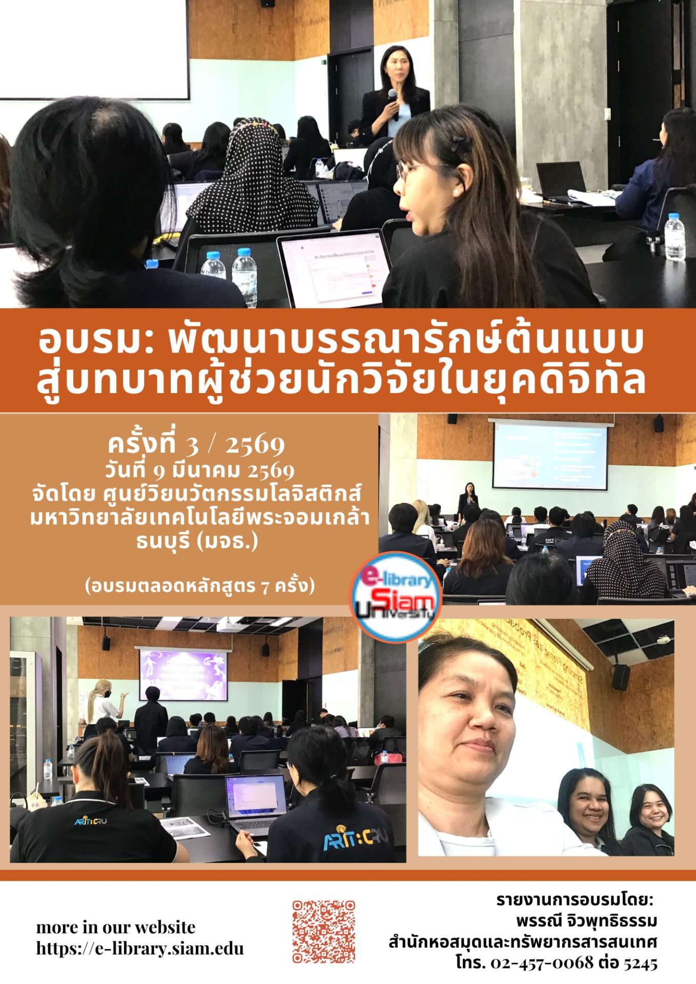 ศูนย์วิจัยนวัตกรรมโลจิสติกส์ มหาวิทยาลัยเทคโนโลยีพระจอมเกล้าธนบุรี (มจธ.) เล็งเห็นความสำคัญในการยกระดับทักษะบุคลากรห้องสมุด ให้มีศักยภาพสอดคล้องกับเทคโนโลยีสารสนเทศและปัญญาประดิษฐ์ในปัจจุบัน จึงได้จัดโครงการ “พัฒนาบรรณารักษ์ต้นแบบสู่บทบาทผู้ช่วยนักวิจัยในยุคดิจิทัล” เพื่อสร้างบรรณารักษ์ต้นแบบที่มีทักษะสนับสนุนงานวิจัยและบริการวิชาการอย่างเป็นรูปธรรม โดยมีกำหนดการอบรมตลอดหลักสูตร 7 ครั้ง / 7 วัน ในช่วงเดือน กุมภาพันธ์ – เมษายน 2569 เวลา 09.00 – 16.00 น. ของทุกวัน (ยกเว้นวันสุดท้าย) ณ อาคาร KX (Knowledge Xchange) กรุงเทพมหานคร  ในการนี้สำนักหอสมุดและทรัพยากรสารสนเทศ มหาวิทยาลัยสยาม ได้พิจารณาจัดส่งบุคลากรเข้าร่วมอบรมคือ นางพรรณี จิวพุทธิธรรม  ซึ่งได้เข้าร่วมอบรมใน ครั้งที่ 3/2569: : ระเบียบวิธีการวิจัยสำหรับผู้ช่วยวิจัย เมื่อวันที่ 9 มีนาคม 2569  ได้รับองค์ความรู้เพิ่มขึ้นจากการอบรม ดังนี้