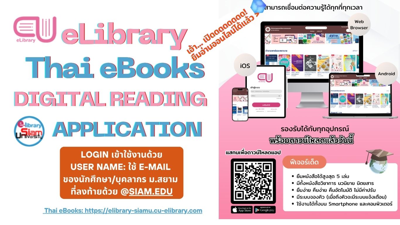 EBOOKS: CU eLibrary สำหรับนักศึกษา คณาจารย์ และบุคลากร ของ ม.สยาม เท่านั้น! ที่ได้รับสิทธิ์อ่าน EBOOKS นี้!!! Link to: https://elibrary-siamu.cu-elibrary.com ครอบคลุมหลากหลายสาขาวิชา ทั้งนี้ มีหนังสือ /ตำราทางด้าน AI บริหารธุรกิจ บริหารการศึกษา และวิทยาศาสตร์สุขภาพ มีเยอะเป็นพิเศษ ทั้งทางด้านพยาบาลศาสตร์ ทันตแพทยศาสตร์ เภสัชศาสตร์ แพทยศาสตร์ จักษุวิทยา ท่านสามารถอ่าน eBooks ได้ โดยสมัครสมาชิกและลงชื่อเข้าใช้งาน/Login ด้วย UserName: ใช้ E-mail ของม.สยาม ที่ลงท้ายด้วย @siam.edu และ Password: กำหนดด้วยตัวเอง