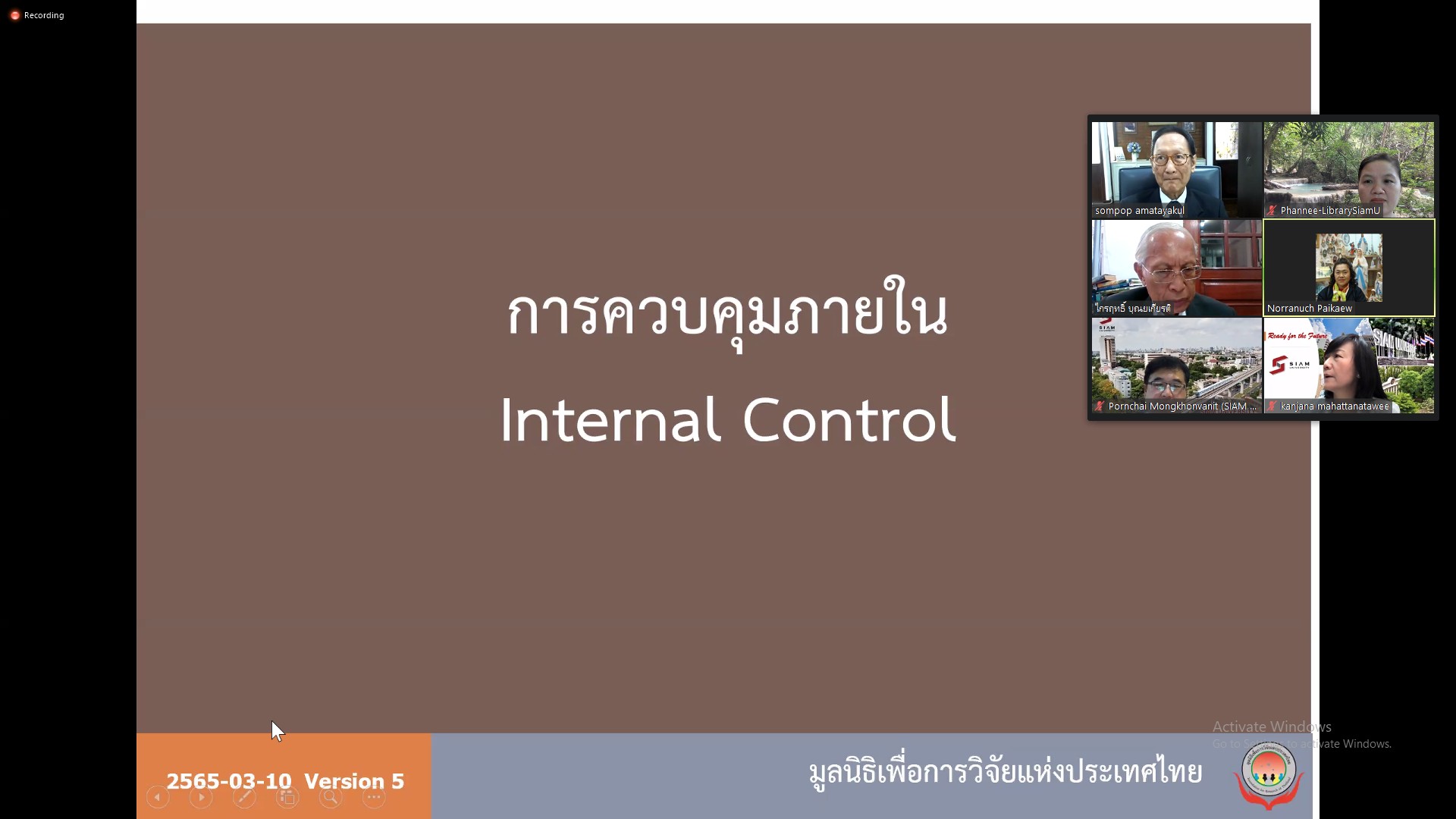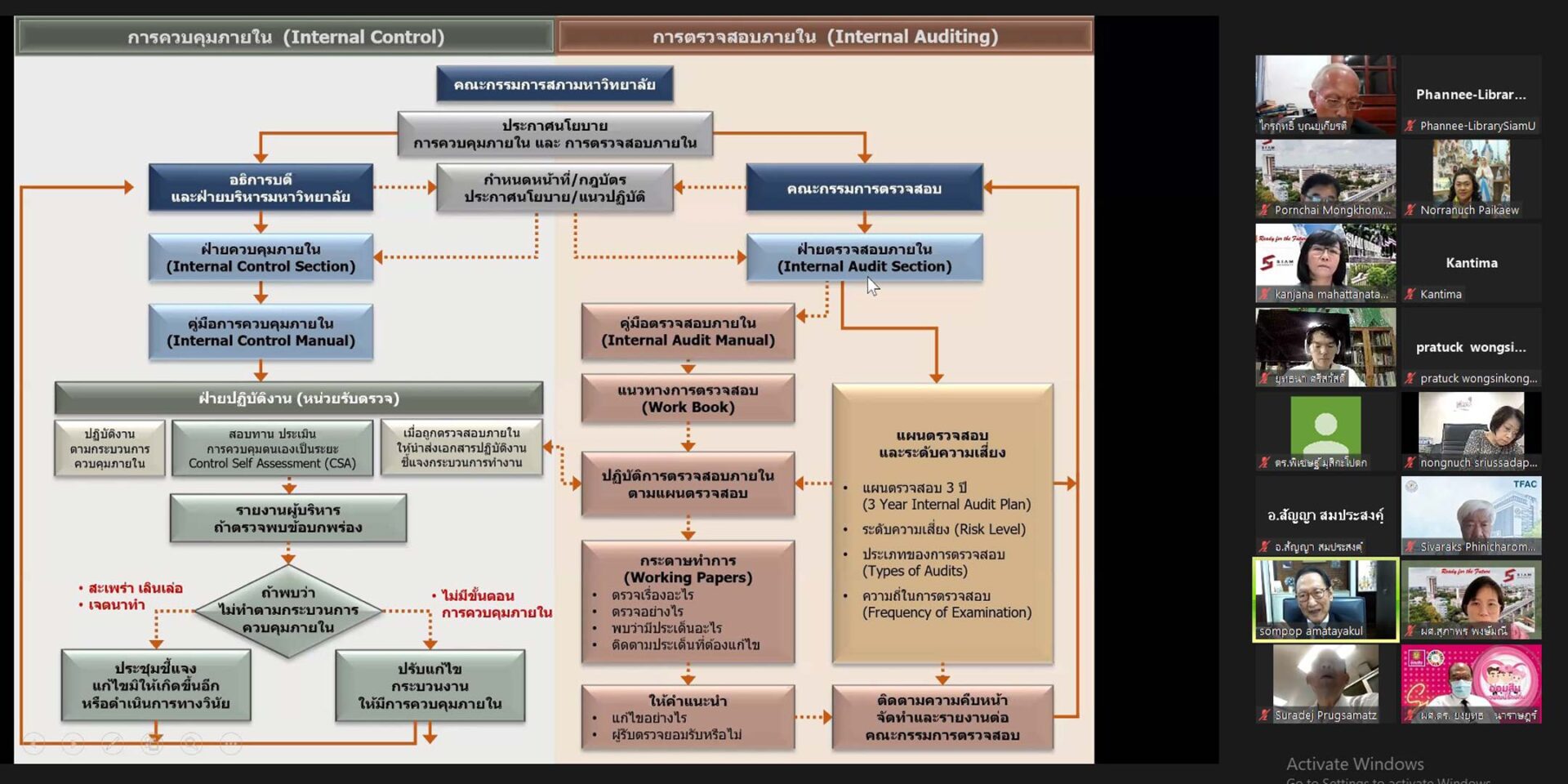 สำนักหอสมุดและทรัพยากรสารสนเทศ มหาวิทยาลัยสยาม ได้จัดส่งบุคลากรเข้าร่วมโครงการสัมมนา เรื่อง “ปรับปรุงระบบการควบคุมภายใน” จัดโดยยคณะกรรมการตรวจสอบประจำมหาวิทยาลัยสยาม คณะกรรมการฯได้เชิญวิทยากร อาจารย์สมภพ อมาตยกุล ซึ่งท่านเป็นวิทยากรผู้เชี่ยวชาญด้านการตรวจสอบและควบคุมภายใน และเป็นกรรมการตรวจสอบ มหาวิทยาลัยสยาม จัดอบรมในวันพฤหัสบดีที่ 10 มีนาคม 2565 เวลา 09.00 – 12.00 น. อบรมออนไลน์ผ่านแอพลิเคชั่น Zoom โดยมีผู้เข้าร่วมอบรมจากสำนักหอสมุดและทรัพยากรสารสนเทศ จำนวน 6 คน ได้แก่ อาจารย์สุธน สุภาวงศ์ (ผู้อำนวยการ) พร้อมด้วยคณะทำงานด้านการจัดการความเสี่