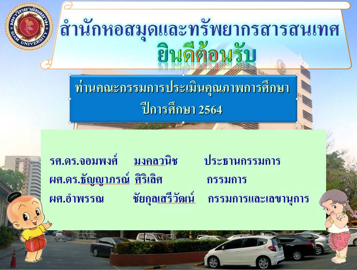 สำนักหอสมุดและทรัพยากรสารสนเทศ มหาวิทยาลัยสยาม รับการตรวจประเมินคุณภาพภายในระดับสำนัก ประจำปีการศึกษา 2564 ในวันพุธที่ 28 กันยายน 2565 เวลา 13.30-16.30 น. ณ สำนักหอสมุดและทรัพยากรสารสนเทศ ซึ่งเป็นการตรวจประเมินการดำเนินงานประกันคุณภาพการศึกษาภายในระดับสำนักอย่างต่อเนื่อง เป็นปีที่ 21 โดยคณะกรรมการตรวจประเมินคุณภาพภายในระดับสำนัก จำนวน 3 ท่าน ได้แก่
