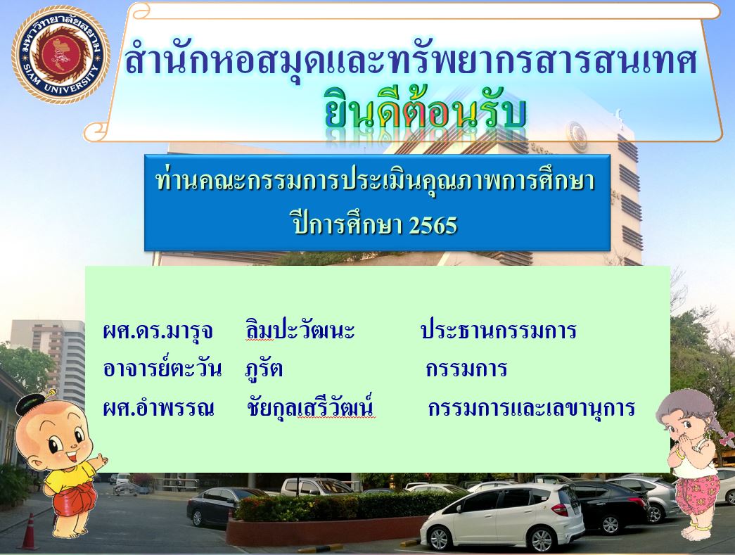 สำนักหอสมุดและทรัพยากรสารสนเทศ มหาวิทยาลัยสยาม รับการตรวจประเมินคุณภาพภายในระดับสำนัก ประจำปีการศึกษา 2565 ในวันศุกร์ที่ 26 พฤษภาคม 2566 เวลา 10.00-12.00 น. ณ สำนักหอสมุดและทรัพยากรสารสนเทศ ซึ่งเป็นการตรวจประเมินการดำเนินงานประกันคุณภาพการศึกษาภายในระดับสำนักอย่างต่อเนื่อง เป็นปีที่ 22 โดยคณะกรรมการตรวจประเมินคุณภาพภายในระดับสำนัก จำนวน 3 ท่าน ได้แก่