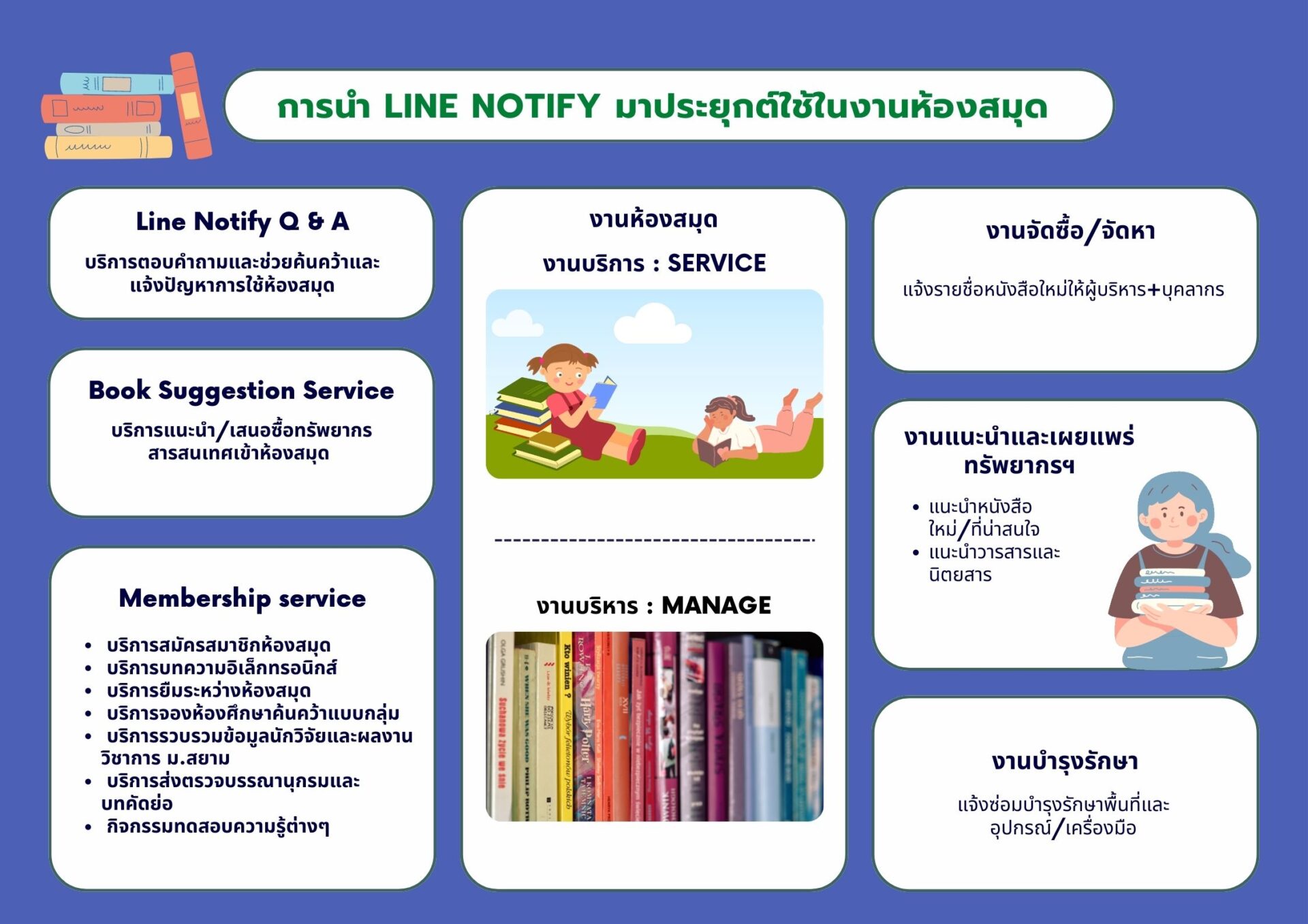 - การนำ Line Notify มาประยุกต์ใช้ในงานห้องสมุด สามารถนำมาประยุกต์ใช้ได้ทั้งในงานบริการและงานบริหาร ดังนี้
