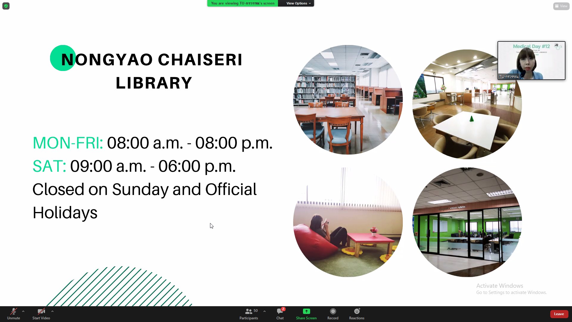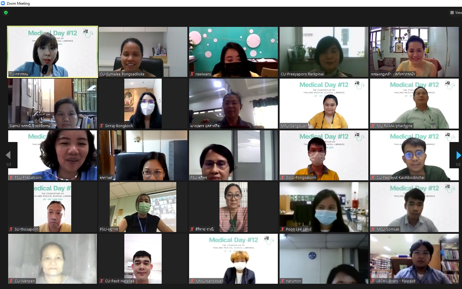กลุ่มห้องสมุดโรงเรียนแพทย์ ได้จัดประชุม Medical Day ครั้งที่ 12 โดยจัดประชุมผ่านสื่ออิเล็กทรอนิกส์ ZOOM เมื่อวันที่ 28-29 มิถุนายน 2564 เวลา 09.00 – 16.00 น. จัดโดย ห้องสมุดนงเยาว์ ชัยเสรี (ห้องสมุดกลุ่มสุขศาสตร์) หอสมุดแห่งมหาวิทยาลัยธรรมศาสตร์ บุคลากรของสำนักหอสมุดและทรัพยากรสารสนเทศ ที่เข้าร่วมประชุม ได้แก่ 1. อาจารย์สุธน สุภาวงศ์2.นางพรรณี จิวพุทธิธรรม 3.นางสุดา ทองชิว