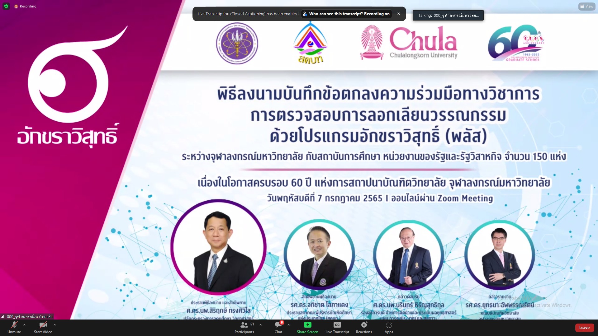 พิธีลงนามบันทึกข้อตกลงความร่วมมือทางวิชาการ การตรวจสอบการลอกเลียนวรรณกรรมด้วยโปรแกรมอักขราวิสุทธิ์ (พลัส) ระหว่างจุฬาลงกรณ์มหาวิทยาลัย กับสถาบันอุดมศึกษา หน่วยงานของรัฐและรัฐวิสาหกิจ จำนวน 150 แห่ง เนื่องในโอกาสครบรอบ 60 ปี แห่งการสถาปนาบัณฑิตวิทยาลัย จุฬาลงกรณ์มหาวิทยาลัย