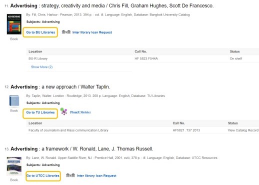 1.3 ปรากฏผลการสืบค้นดังภาพ ให้ตรวจสอบว่าหนังสือมีให้บริการที่ห้องสมุดใดโดยดูจาก ชื่อ ห้องสมุด (ดังภาพ)