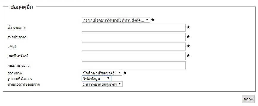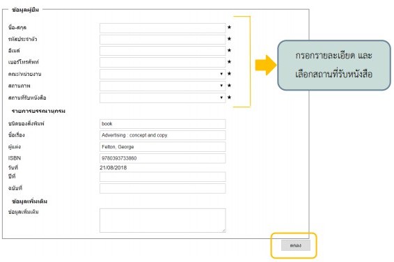1.5 กรอกข้อมูลที่กำหนดให้ครบถ้วน จากนั้นคลิก ตกลง (ระบบจะจัดส่งข้อมูลการยืมไปยัง e-mail ของผู้ให้บริการโดยอัตโนมัติ)