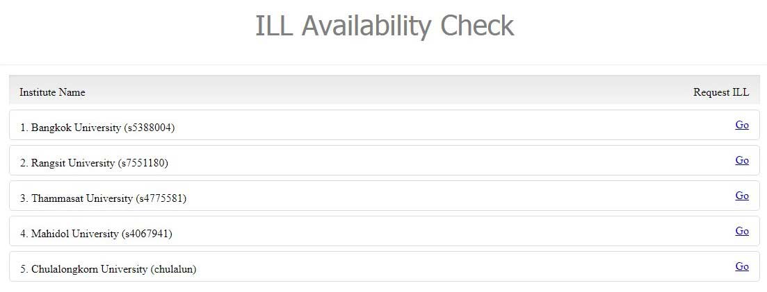 2.2 เลือกขอบทความจากรายชื่อห้องสมุดที่มีให้บริการ (ควรเลือกห้องสมุดที่ให้บริการแบบไม่มีค่าใช้บริการก่อนเป็นอันดับแรก) แล้วคลิกที่ Go