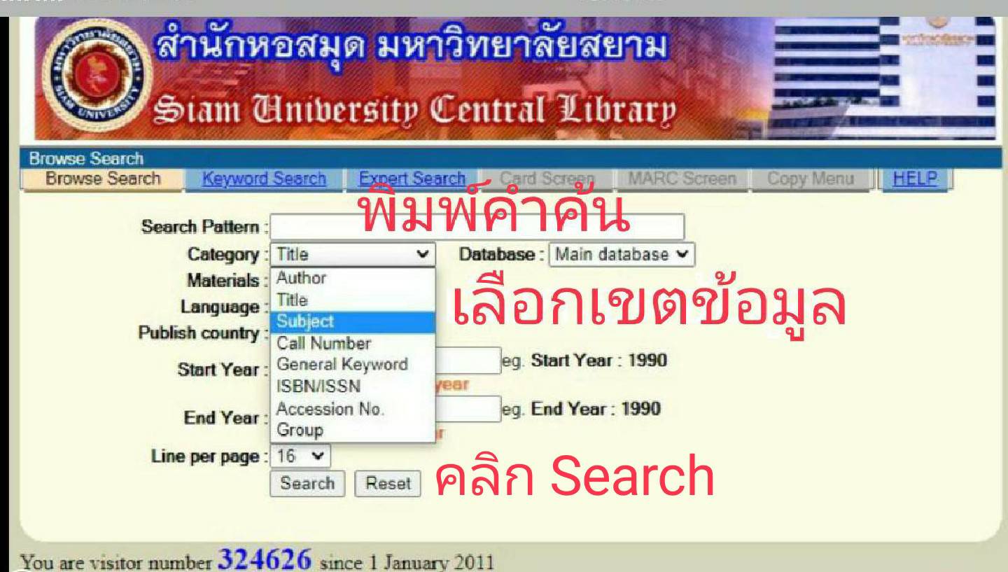 วิธีการค้นหาหนังสือในห้องสมุด Library Catalog ( คู่มือการค้นหาหนังสือ: PDF)