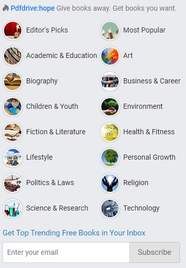 Pdfdrive:hope Give books away. Get books you want. Editor’s Picks Most Popular Academic & Education, Art, Biography, Business & Career, Children & Youth, Environment, Fiction & Literature, Health & Fitness, Lifestyle, Personal Growth, Politics & Laws, Religion, Science & Research, Technology, Get Top Trending Free Books in Your Inbox. Enter your email.