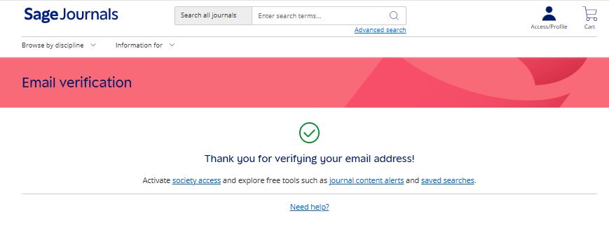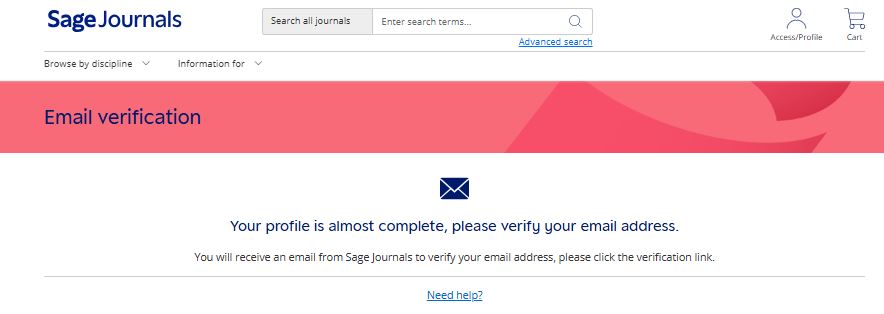 3. Your profile is almost complete, please verify your email address. You will receive an email from Sage Journals to verify your email address, please click the verification link. คลิกลิงก์ยืนยันที่ อีเมลของตนเอง จะขึ้นข้อความ Thank yoy ที่เว็บไซต์วารสาร และสามารถใช้งานได้เลย