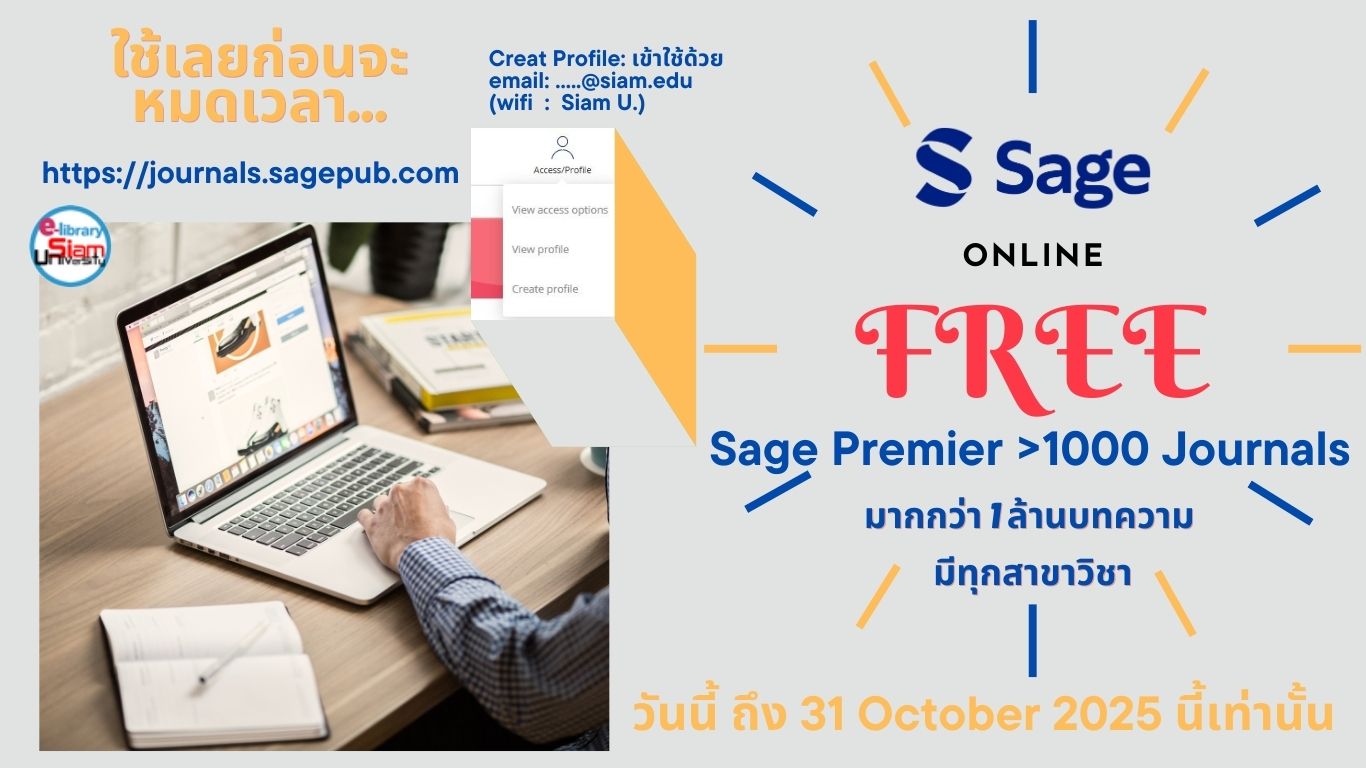 สำนักหอสมุดฯ ขอประชาสัมพันธ์เชิญชวน ทดลองใช้ฐานข้อมูลของสำนักพิมพ์ Sage Publications โดยเป็นฐานข้อมูลที่มีวารสารและบทความครอบคลุมในทุกสาขาวิชา ที่มากกว่า 1000 วารสาร และมากกว่า 1 ล้านบทความ ท่านที่สนใจสามารถเข้าไปยัง https://journals.sagepub.com/ สร้าง Profile ของตนเอง โดยใช้ email ของมหาวิทยาลัยในการสมัคร สามารถเข้าไปใช้งานได้ตั้งแต่วันนี้ถึง วันที่ 31 ตุลาคม 2568 อยากให้เข้าไปใช้เยอะๆ เพราะ download บทความที่ต้องการเก็บไว้ก่อนได้ ถ้าหลังทดลองใช้แล้ว จะไม่สามารถดาวน์โหลดบทความฉบับเต็มของสำนักพิมพ์ Sage ได้นะ…
