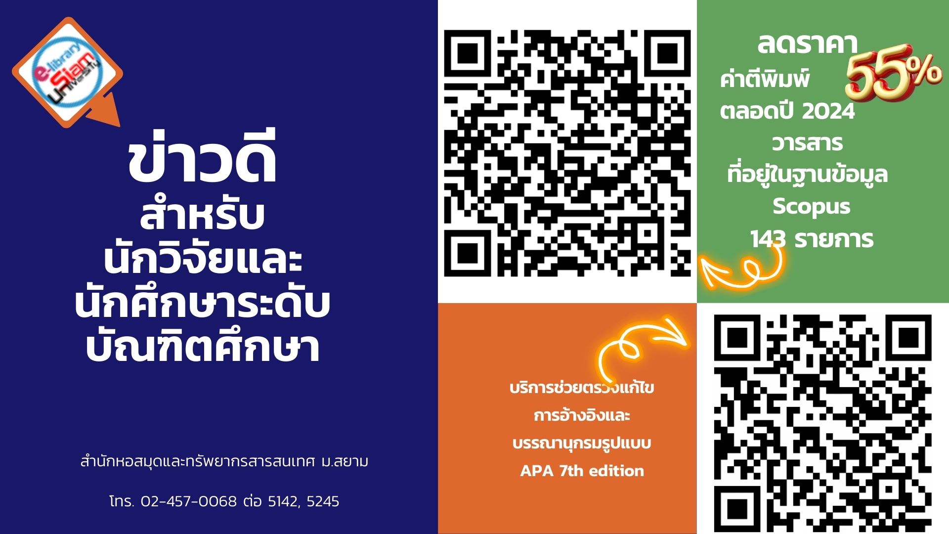 สำนักหอสมุดและทรัพยากรสารสนเทศ ยินดีให้คำปรึกษา โทร. 0-2457-0068 ต่อ 5245 กด 22 คุณพรรณี จิวพุทธิธรรม email: lib2@siam.edu หรือส่งผลงานให้ช่วยตรวจสอบได้ตามแบบฟอร์มนี้