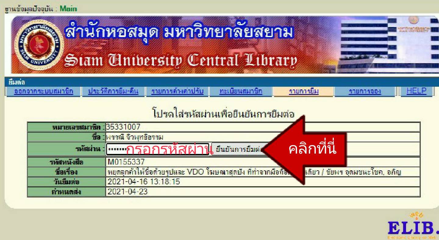 5. กรอก รหัสผ่าน(Password) แล้วคลิก ยืนยันการยืมต่อ/Confirm