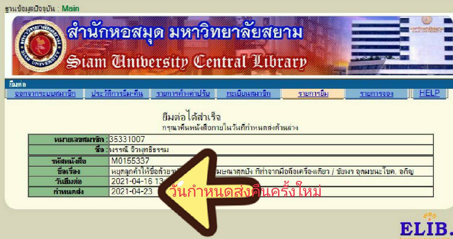 6. หนังสือที่ยืมต่อสำเร็จจะแสดง วันกำหนดส่งคืนครั้งใหม่