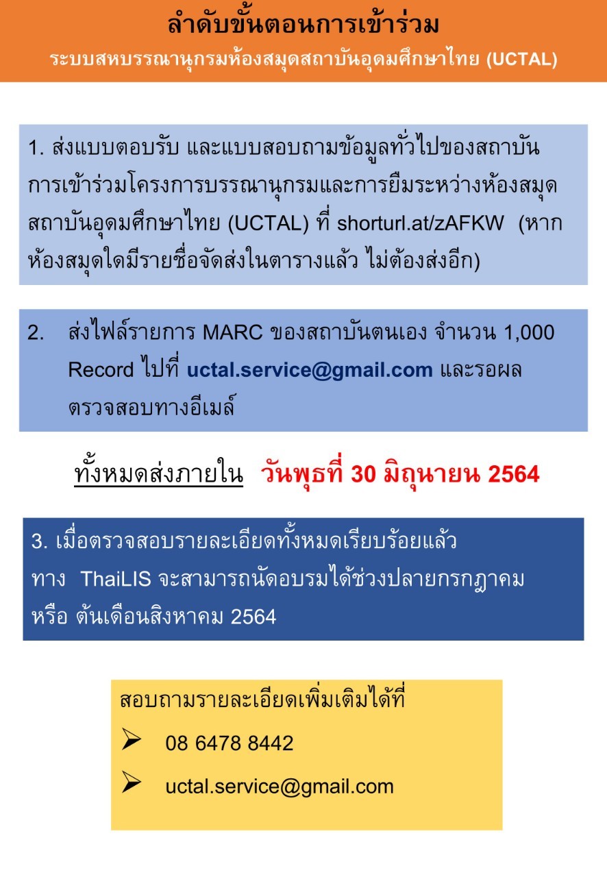 โครงการพัฒนาเครือข่ายห้องสมุดในประเทศไทย ThaiLIS และ  UniNET ได้จัดประชุมชี้แจงเพื่อเตรียมความพร้อมในการใช้งานฐานข้อมูลสหบรรณานุกรมห้องสมุดสถาบันอุดมศึกษาไทย (UCTAL) ให้กับห้องสมุดสถาบันอุดมศึกษาเอกชน โดยจัดประชุมผ่านสื่ออิเล็กทรอนิกส์ ZOOM เมื่อวันอังคารที่ 15 มิถุนายน 2564 บุคลากรของสำนักหอสมุดและทรัพยากรสารสนเทศ มหาวิทยาลัยสยาม ที่เข้าร่วมประชุม ได้แก่ 1. อาจารย์สุธน สุภาวงศ์  2.อาจารย์วสันต์  อุทัยเลี้ยง  3.นายสุทธิพจน์ ลิ้มอุดมพัฒน์   4.นางสุดา   ทองชิว   5.นางณัชชา เดชาเต็งประทีป  6.นางพรรณี จิวพุทธิธรรม