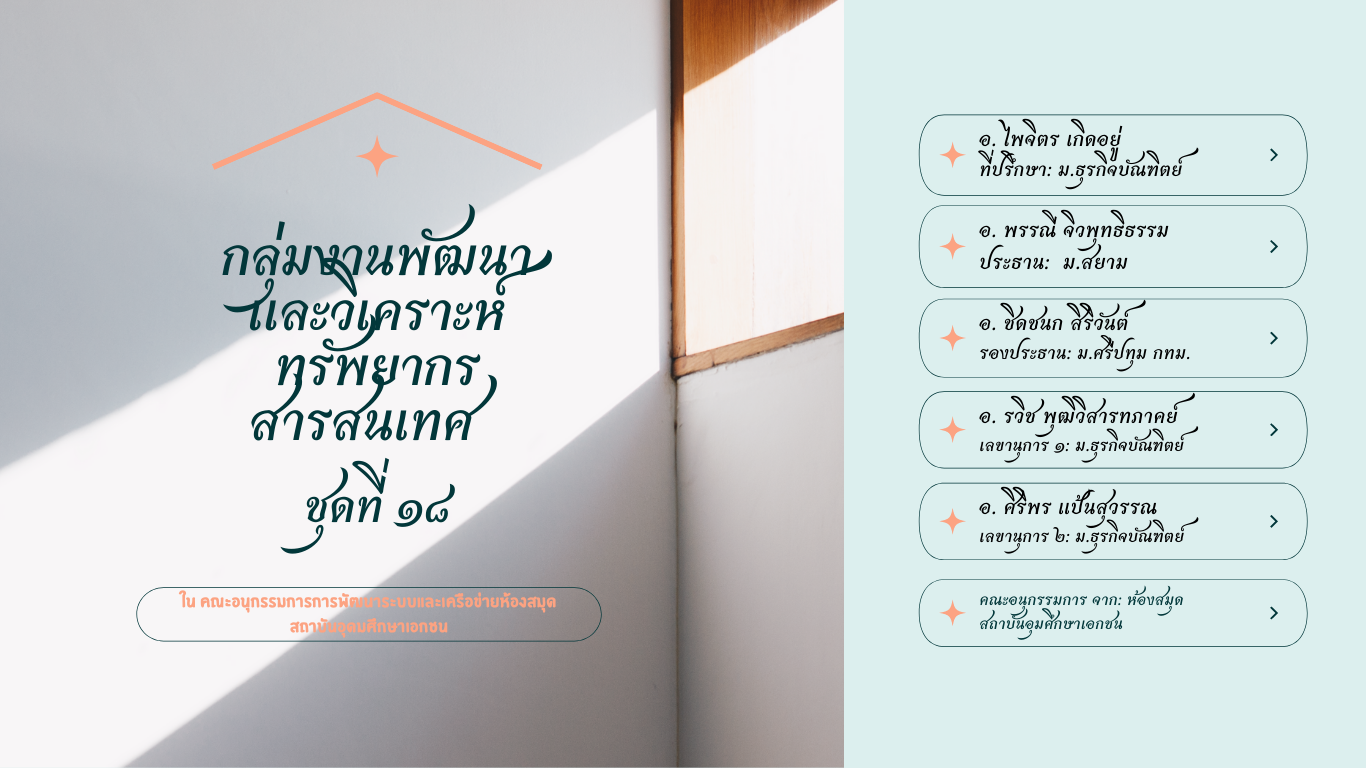 * รู้จัก กลุ่มงานพัฒนาและวิเคราะห์ทรัพยากรสารสนเทศ ในคณะอนุกรรมการพัฒนาระบบและเครือข่ายห้องสมุดสถาบันอุดมศึกษาเอกชน (อพส.)