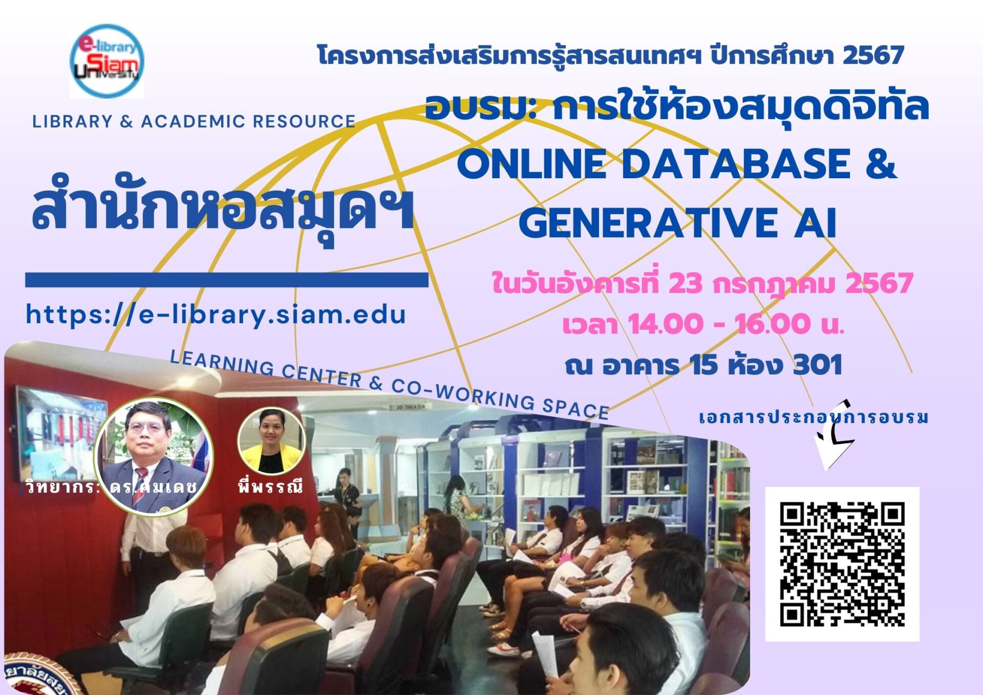 สำนักหอสมุดและทรัพยากรสารสนเทศ ม.สยาม ได้จัดโครงการ “ส่งเสริมการรู้สารสนเทศและการเรียนรู้ตลอดชีวิต ปีการศึกษา 2567″ ในกิจกรรมครั้งที่ 3/2567 อบรม: “การใช้ห้องสมุดดิจิทัล ONLINE DATABASE & Generative AI” ในวันอังคารที่ 23 กรกฎาคม 2567 เวลา 14.00 – 16.00 น. ณ อาคาร 15 ห้อง 301 วิทยากรโดย ดร.คมเดช บุญประเสริฐ และ พี่พรรณี จิวพุทธิธรรม จัดอบรมให้กับนักศึกษาคณะพยาบาลศาสตร์ เพื่อเป็นการพัฒนาทักษะของนักศึกษา มหาวิทยาลัยสยาม ในการสืบค้นและเข้าถึงทรัพยากรสารสนเทศอิเล็กทรอนิกส์ การใช้ฐานข้อมูลวิชาการออนไลน์ที่สำนักฯได้จัดซื้อ และการใช้ Generative AI เพื่อใช้ประกอบการเรียนการสอนและการวิจัย อีกทั้งเป็นการกระตุ้นการใช้ทรัพยากรสารสนเทศอย่างคุ้มค่าก่อให้เกิดประโยชน์สูงสุด