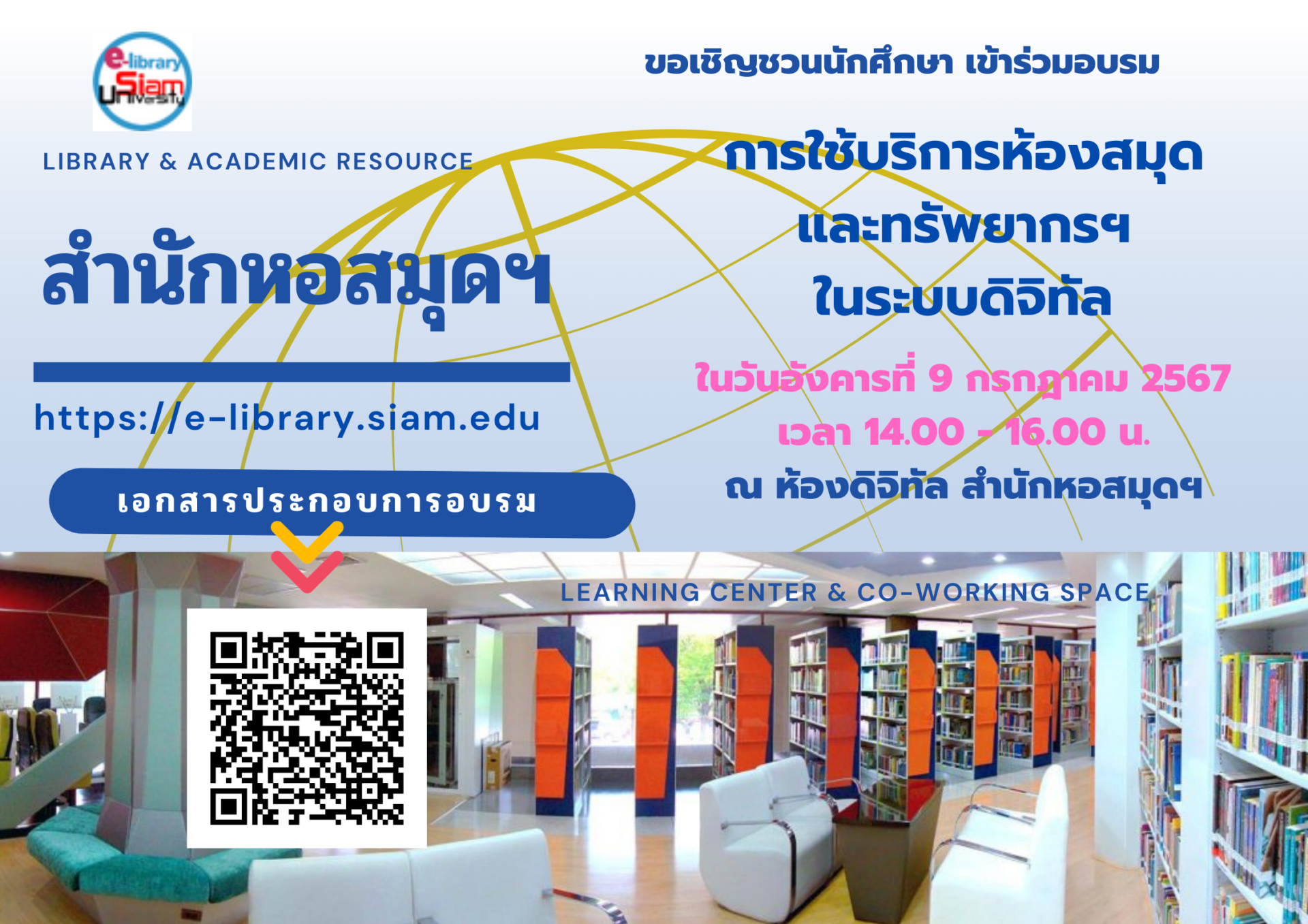 สำนักหอสมุดและทรัพยากรสารสนเทศ ม.สยาม ได้จัดโครงการ “ส่งเสริมการรู้สารสนเทศและการเรียนรู้ตลอดชีวิต ปีการศึกษา 2567″ ในกิจกรรมครั้งที่ 2/2567 การฝึกอบรม “การใช้บริการห้องสมุดและทรัพยากรฯ ในระบบดิจิทัล” ในวันอังคารที่ 9 กรกฎาคม 2567 เวลา 14.00 – 16.00 น. ณ ห้องดิจิทัล สำนักหอสมุดฯ วิทยากรโดย ดร.คมเดช บุญประเสริฐ และ พรรณี จิวพุทธิธรรม จัดอบรมให้กับนักศึกษาคณะแพทยศาสตร์ หลักสูตรสาธารสุขศาสตร์ เพื่อเป็นการพัฒนาทักษะของนักศึกษาของมหาวิทยาลัยสยาม ในการสืบค้นและเข้าถึงทรัพยากรสารสนเทศอิเล็กทรอนิกส์ ในฐานข้อมูลวิชาการออนไลน์ที่สำนักฯได้จัดซื้อ เพื่อใช้ประกอบการเรียนการสอนและการวิจัย อีกทั้งเป็นการกระตุ้นการใช้ทรัพยากรสารสนเทศอย่างคุ้มค่าก่อให้เกิดประโยชน์สูงสุด ดาวน์โหลดเอกสารการอบรม (PDF): การใช้บริการห้องสมุดและทรัพยากรฯ ในระบบดิจิทัล