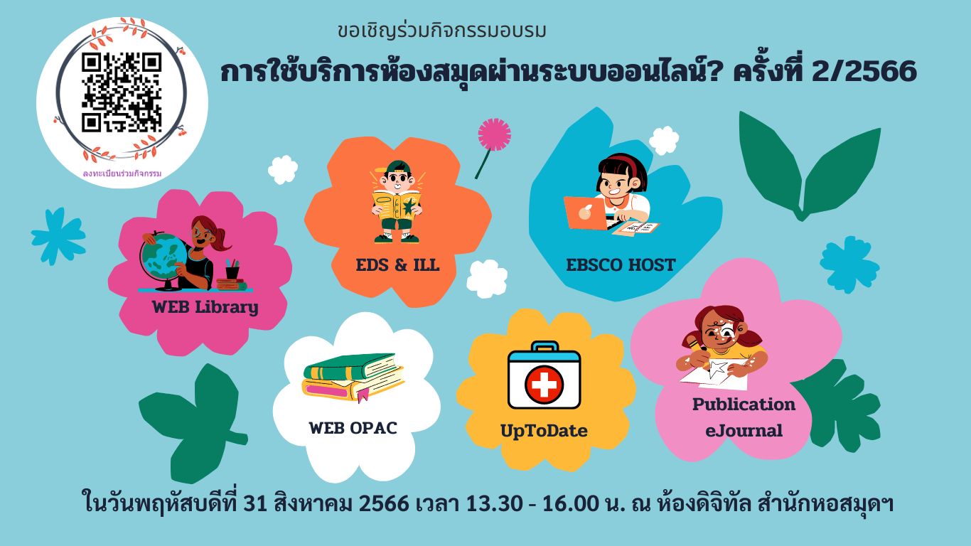 สำนักหอสมุดและทรัพยากรสารสนเทศ ม.สยาม ได้จัดอบรมเรื่อง “ “การใช้บริการห้องสมุดผ่านระบบออนไลน์! และการสืบค้นฐานข้อมูลวิชาการออนไลน์ EBSCO Host & EDS, และการใช้บริการยืมระหว่างห้องสมุดด้วยระบบ EDS” ให้กับนักศึกษาคณะศิลปศาสตร์ วันพฤหัสบดีที่ 31 สิงหาคม 2566 เวลา 13.30 – 16.00 น. ณ ห้องดิจิทัล สำนักหอสมุดฯ ดาวน์โหลดเอกสารประกอบการอบรม: การใช้บริการห้องสมุดผ่านระบบออนไลน์! (PDF)