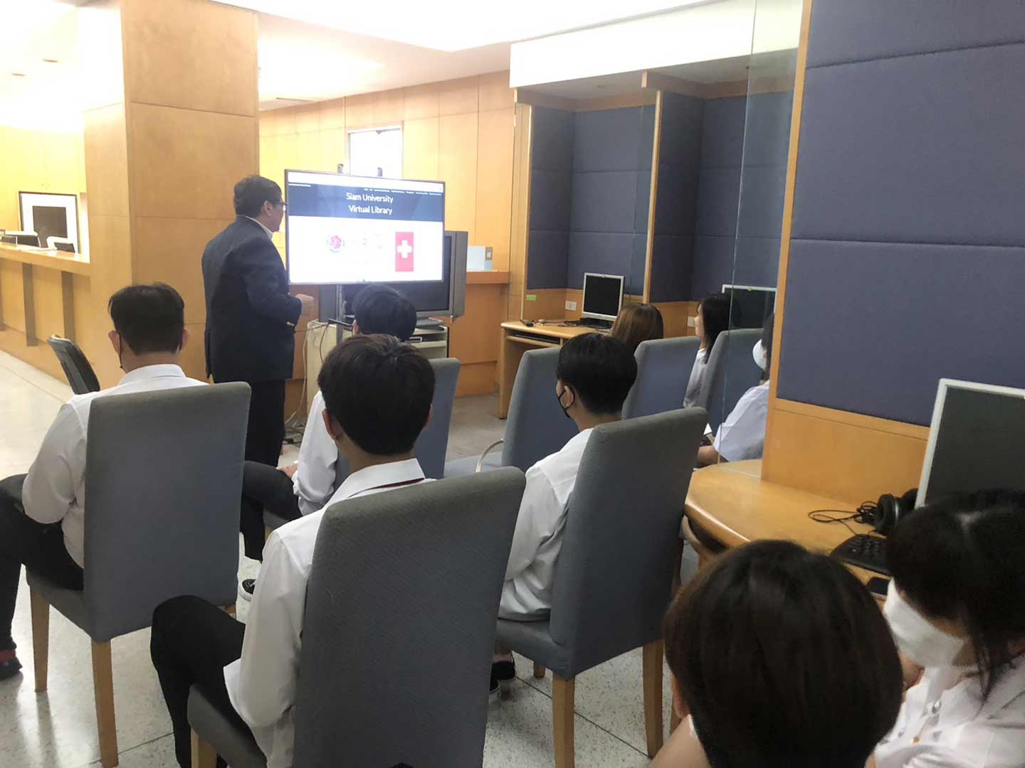 สำนักหอสมุดและทรัพยากรสารสนเทศ ม.สยาม ได้จัดอบรมเรื่อง “การสืบค้นฐานข้อมูลวิชาการออนไลน์ และการใช้ห้องสมุด” ให้กับนักศึกษาคณะสาธารสุขศาสตร์ เมื่อวันพฤหัสบดีที่ 10 สิงหาคม 2566 เวลา 10.00 – 12.00 น. วิทยากรโดย ดร.คมเดช บุญประเสริฐ