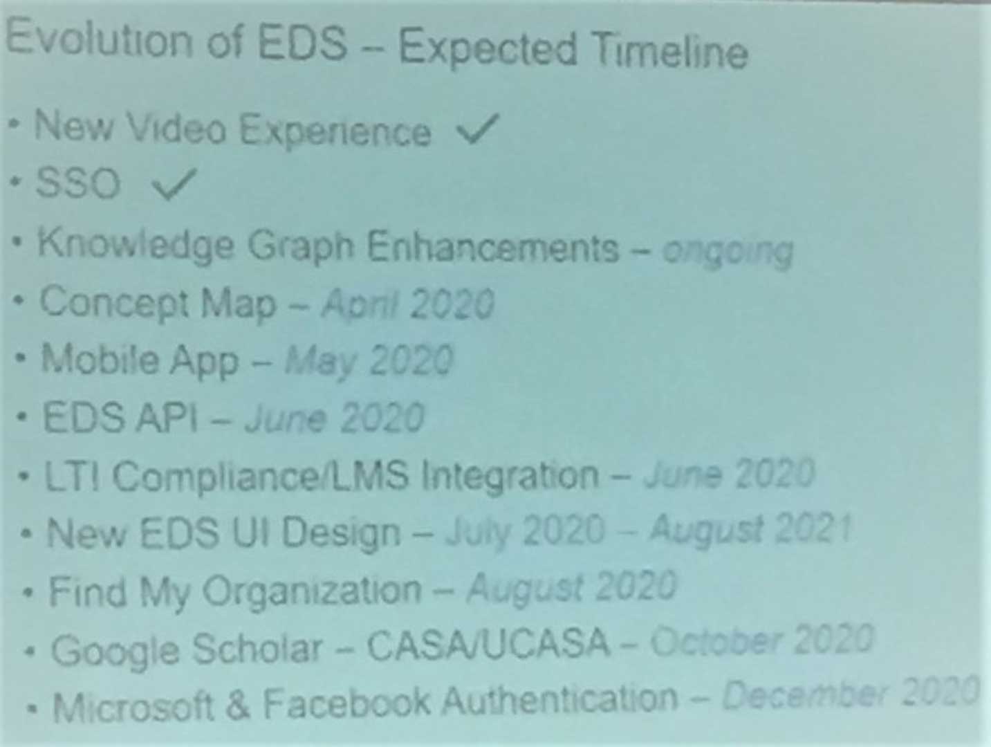 - 1. Evolution of EDS บริษัท EBSCO ได้พัฒนาระบบ EDS โดยได้วางแผนงานตามระยะเวลาที่คาดว่าจะดำเนินการแล้วเสร็จ ดังนี้