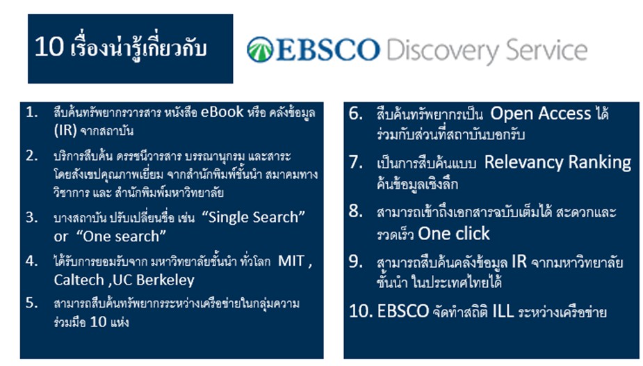 - 4. บ. EBSCO จะจัดทำคู่มือการดึงข้อมูล eBook link และหน้าปก เพื่อให้ทุกสถาบันนำไปใช้ในการประชาสัมพันธ์ eBooks ที่บอกรับกับ EBSCO