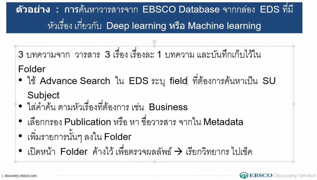 - 5. สาธิตการสืบค้น วารสาร จาก ฐานข้อมูล EBSCO ในกรณีที่คณาจารย์ต้องการตีพิมพ์บทความในวารสารที่มีเนื้อหาเกี่ยวข้องกับบทความ นอกจากจะสามารถสืบค้นได้จาก Scopus แล้ว คณาจารย์สามารถสืบค้นได้จากกล่อง EDS