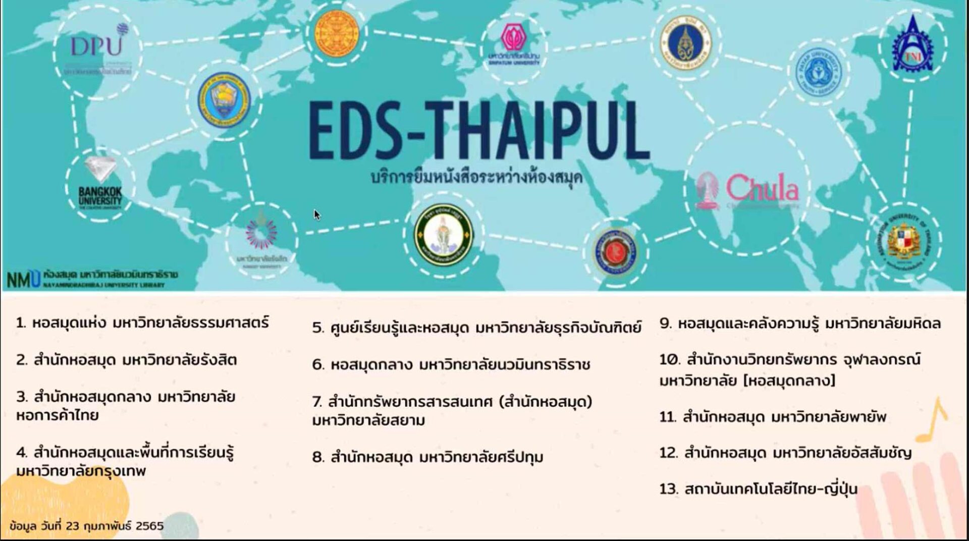 - เพื่อรับรู้ความก้าวหน้าของระบบ/ฐานข้อมูลออนไลน์ EDS (EBSCO Discovery Service) ที่นำมาใช้ในการให้บริการยืมระหว่างห้องสมุด (Inter library loan)