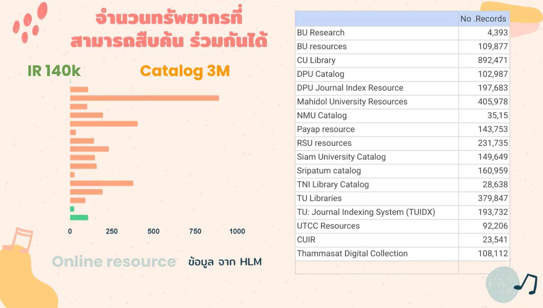 - สรุปจำนวนทรัพยากร ทรัพยากรที่สารมารถยืมระหว่างสถาบันในเครือข่ายมากกว่า 3 ล้านรายการ และจะมีจำนวนทรัพยากรเพิ่มมากขึ้นมาจากมหาวิทยาลัยอัสสัมชัญ/ABAC ขณะนี้ สมาชิกสามารถสืบค้นทรัพยากรของ ABAC ในกล่อง EDS -Thaipul ได้แล้ว โดยทรัพยากรมี 2 ประเภทได้แก่ ABAC catalog ซึ่งในส่วนนี้จะมีค่าใช้จ่ายในการจัดส่งทรัพยากรทางไปรษณีย์ แต่ไม่คิดค่าบริการ ส่วน ABAC IR สามารถเข้าใช้งานได้ แบบ Online