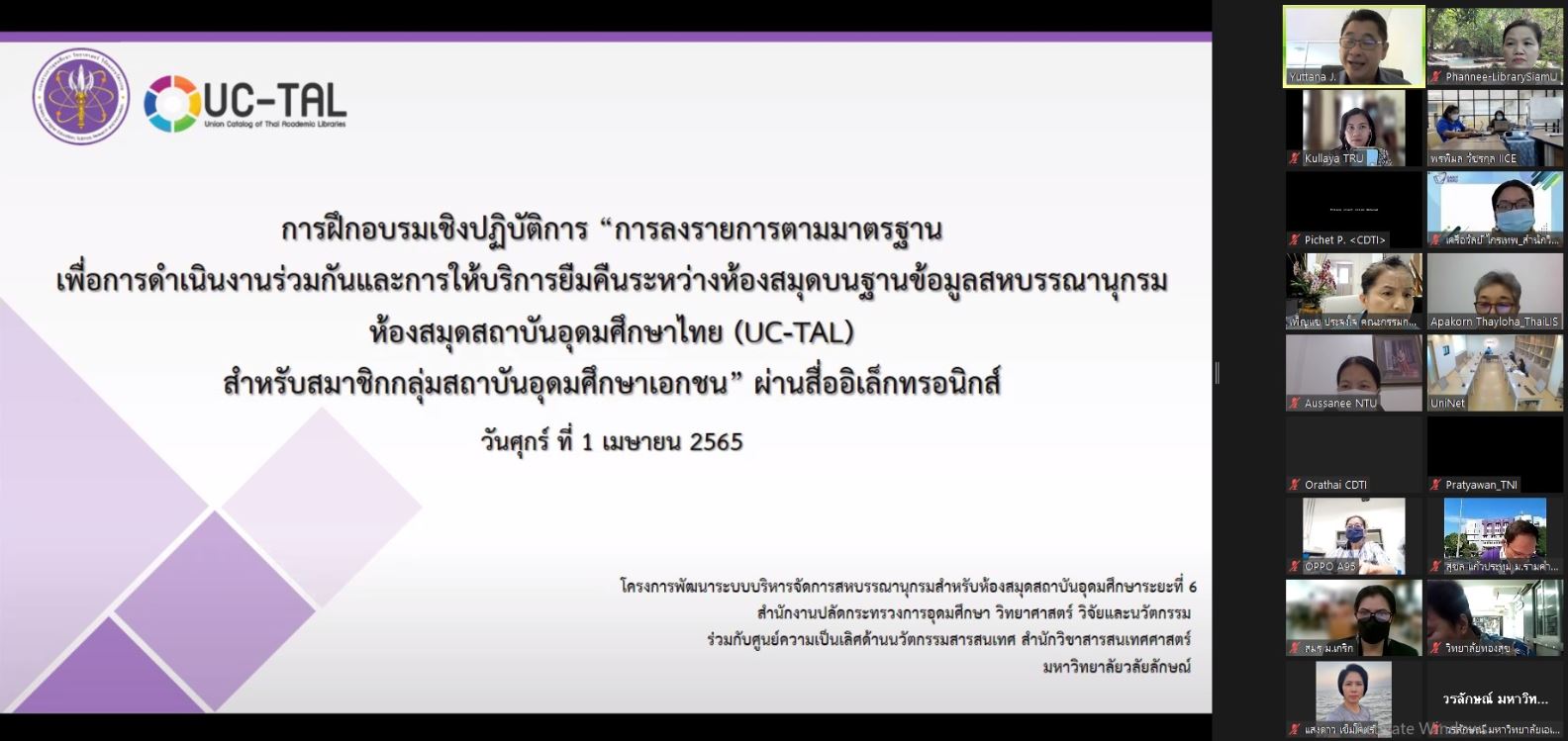 สำนักงานปลัดกระทรวงการอุดมศึกษาฯ ได้จัดฝึกอบรมเชิงปฏิบัติการ “การลงรายการตามมาตรฐานเพื่อการดำเนินงานร่วมกันและการให้บริการยืมคืนระหว่างห้องสมุดบนฐานข้อมูลสหบรรณานุกรมห้องสมุดสถาบันอุดมศึกษาไทย (UC-TAL) สำหรับสมาชิกกลุ่มสถาบันอุดมศึกษาเอกชน” ในวันศุกร์ที่ 1 เมษายน 2565 เวลา 08.00 – 16.30 โดยประชุม ผ่านสื่ออิเล็กทรอนิกส์ ซึ่งสำนักหอสมุดและทรัพยากรสารสนเทศ ได้จัดส่งบุคลากรเข้ารับการอบรม จำนวน 5 คน ได้แก่ อาจารย์สุธน สุภาวงศ์ นางพรรณี จิวพุทธิธรรม นางณัชชา เดชาเต็งประทีป นางสุดา ทองชิว และนายสุทธิพจน์ ลิ้มอุดมพัฒน์